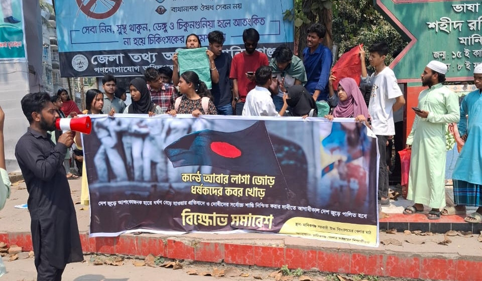 দেশব্যাপী ধর্ষণ ও নারী নিপীড়নের ঘটনার সুষ্ঠু তদন্ত ও ধর্ষকদের সর্বোচ্চ শাস্তির দাবিতে বিক্ষোভে সারা দিন উত্তাল ছিল ঢাকার পার্শ্ববর্তী জেলা মানিকগঞ্জ।